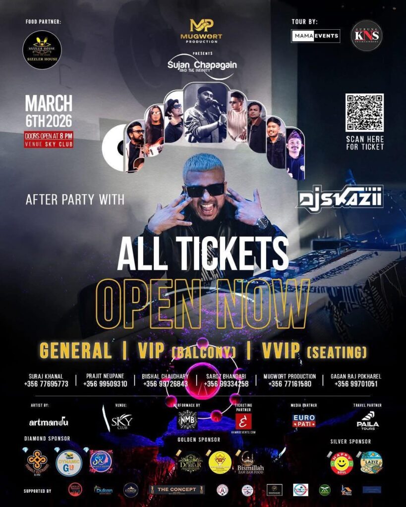 माल्टा  माल्टामा रहेका नेपाली संगीत पारखीहरूका लागि ‘मग्वर्ट प्रोडक्सन’ ले एक अविस्मरणीय सांगीतिक साँझको सौगात लिएर आउने भएको छ । नेपाली युवा पुस्ताका ढुकढुकी तथा चर्चित गायक सुजन चापागाईं र उनको ब्यान्ड ‘द इन्फिनिटी’ ले यही आउँदो मार्च ०६, २०२६ शुक्रबारका दिन माल्टाको स्काई क्लबमा आफ्नो दमदार प्रस्तुति दिने भएका छन् । प्रवासमा रहेर पनि नेपाली कला र संगीतको प्रवर्द्धन गर्ने उद्देश्यले मग्वर्ट प्रोडक्सनले यो ऐतिहासिक कार्यक्रमको आयोजना गरेको हो ।