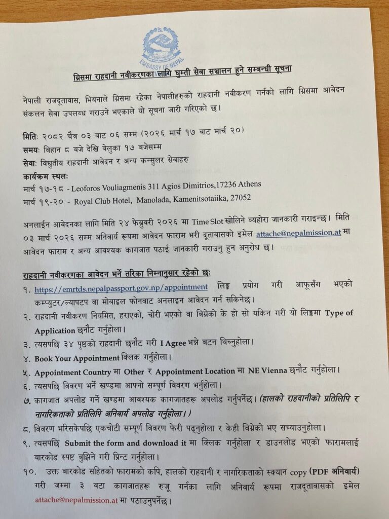 ग्रीस — भियनास्थित नेपाली राजदूतावासले ग्रीसमा रहेका नेपाली नागरिकहरूका लागि राहदानी नवीकरण तथा अन्य कन्सुलर सेवा प्रदान गर्न विशेष ‘घुम्ती सेवा’ सञ्चालन गर्ने भएको छ । दूतावासले हालै एक सार्वजनिक सूचना जारी गर्दै आगामी मार्च १७ देखि २० तारिखसम्म ग्रीसका विभिन्न सहरमा पुगेर सेवा दिने जानकारी दिएको हो ।