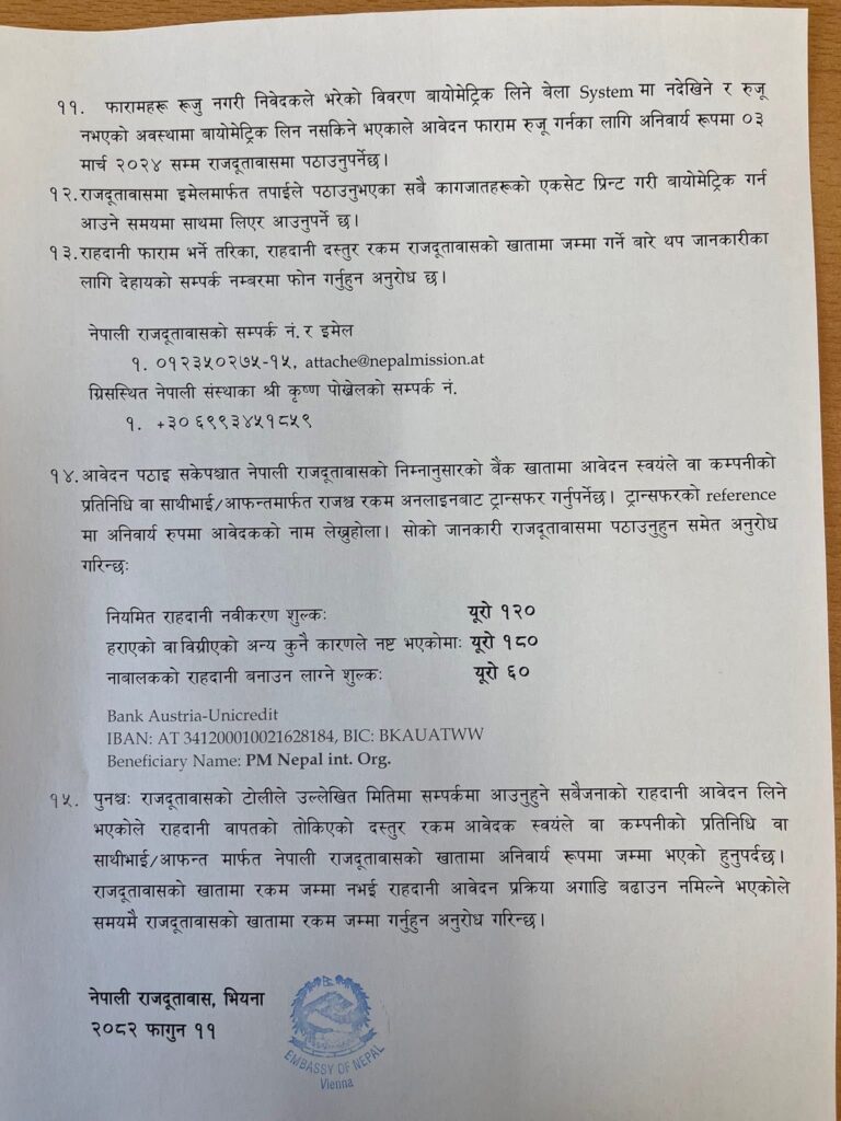 राजदूतावासले सेवा शुल्कको विवरण पनि सार्वजनिक गरेको छ, जस अनुसार नियमित राहदानी नवीकरणका लागि १२० युरो, हराएको वा बिग्रिएको राहदानीको हकमा १८० युरो र नाबालिगको राहदानीका लागि ६० युरो तोकिएको छ । यो रकम आवेदकले बैंक अस्ट्रिया-युनिक्रेडिट (Bank Austria-Unicredit) मा रहेको दूतावासको खातामा अनलाइनमार्फत जम्मा गर्नुपर्नेछ ।