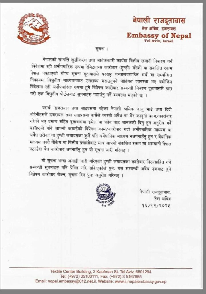 साइप्रस — इजरायलका लागि नेपाली राजदूतावासले विदेशमा रहेर गरिने अवैध वित्तीय गतिविधि र अनौपचारिक रेमिट्यान्स (हुण्डी) कारोबारलाई निरुत्साहित गर्न एक कडा सूचना जारी गरेको छ । नेपालको सम्पत्ति शुद्धीकरण तथा आतंकवादी क्रियाकलापमा वित्तीय लगानी निवारण गर्ने राष्ट्रिय नीति अनुरूप दूतावासले यस्तो कदम चालेको हो ।