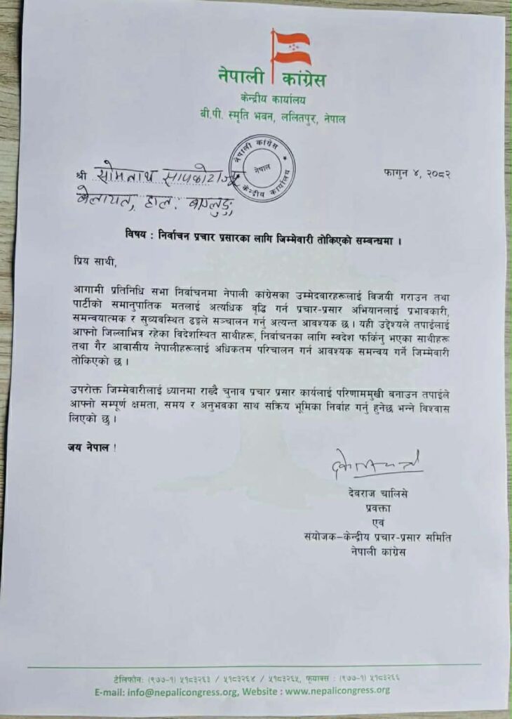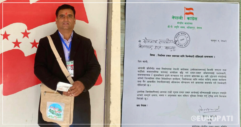 Portugal — Som Nath Sapkota, a long-time advocate for Nepali politics and diaspora engagement, has been appointed as a member of the Election Publicity Committee of the Nepali Congress. This appointment recognizes his decades of dedication to the party and his active work connecting Nepalis around the world.
