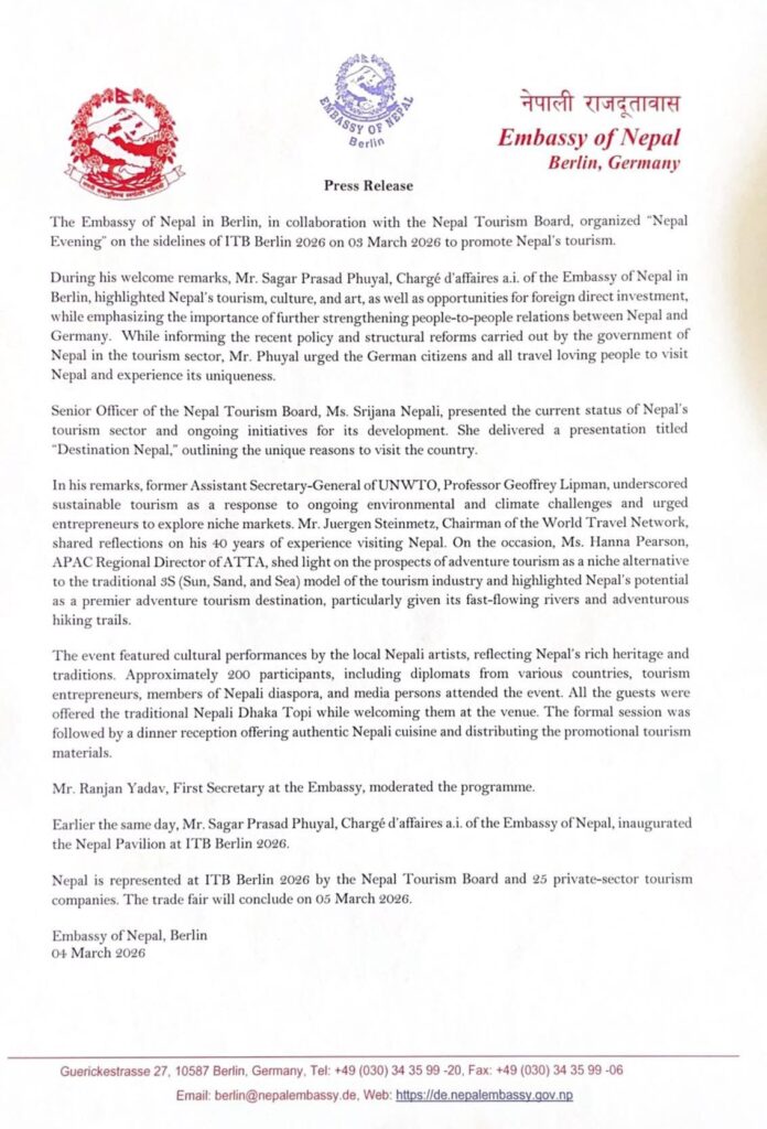 बर्लिन (जर्मनी) जर्मनीको बर्लिनमा जारी विश्व प्रसिद्ध पर्यटन मेला ‘आईटीबी बर्लिन २०२६’ को अवसर पारेर नेपाली राजदूतावास र नेपाल पर्यटन बोर्डको संयुक्त आयोजनामा ‘नेपाल साँझ’ कार्यक्रम भव्य रूपमा सम्पन्न भएको छ । मार्च ३ तारिखमा आयोजित उक्त विशेष समारोहमा नेपालको अद्वितीय पर्यटन क्षेत्र, कला, संस्कृति र लगानीका सम्भावनाहरूको बारेमा विश्व समुदायलाई जानकारी गराइयो ।