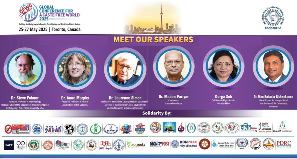 टोरन्टो – क्यानडामा दर्ता भएको गैर-सरकारी संस्था सहयात्रा-क्यानडाले दक्षिण एसिया र उत्तर अमेरिका क्षेत्रका विभिन्न संस्थाहरूसँगको सहकार्यमा ‘जातीय विभेद मुक्त विश्वका लागि विश्व सम्मेलन २०२५’ आयोजना गर्न लागेको छ। यो सम्मेलन २५ मेदेखि २७ मेसम्म क्यानडाको टोरन्टोमा आयोजना हुनेछ, जसको मुख्य विषयवस्तु “समानता, सामाजिक न्याय, र जाति प्रथाको उन्मूलनतर्फ ऐक्यबद्धता निर्माण” रहनेछ।