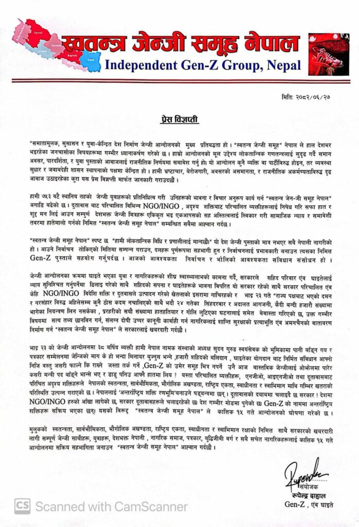 विदेशीबाट परिचालित समूह र सरकारविरुद्ध कात्तिक १५ गते आन्दोलन घोषणा, आन्दोलनका घाइते र वास्तविक आन्दोलनकारीलाई पाखा लगाइएको दाबी गरेको भन्दै स्वतन्त्र जेनजी समूहले आपत्ति जनाएको छ ।