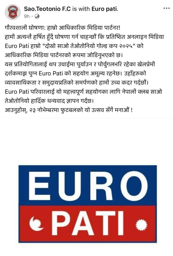 पोर्चुगल — पोर्चुगलको सक्रिय र प्रतिष्ठित सामुदायिक संस्था नेपाली क्लब साओ टियोटोनियोले आफ्नो बहुप्रतीक्षित फुटबल प्रतियोगिता “दोस्रो साओ टियोटोनियो गोल्ड कप २०२५” को लागि आधिकारिक मिडिया पार्टनरको रूपमा युरोपाटीलाई चयन गरेको छ ।