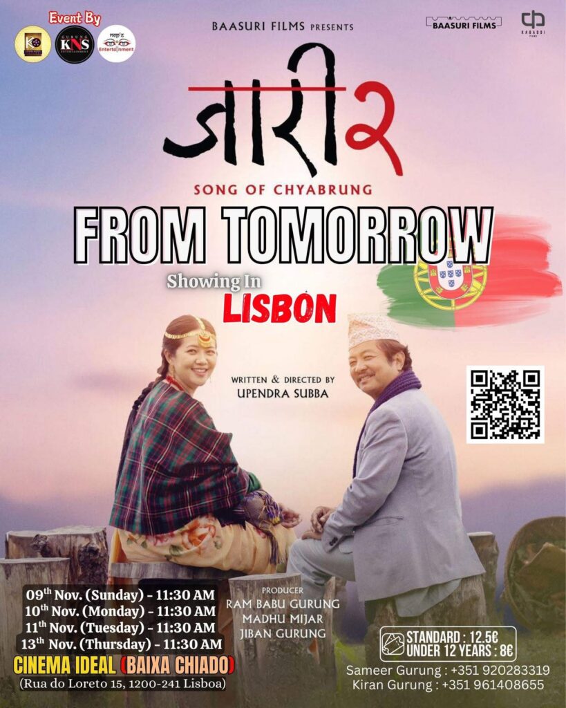 पोर्चुगल — गत वर्ष बक्स अफिसमा कीर्तिमानी सफलता हासिल गरेको नेपाली चलचित्र ‘जारी’को दोस्रो श्रृंखला ‘जारी २’ युरोपेली मुलुक पोर्चुगलमा प्रदर्शन हुने भएको छ । पोर्चुगलमा बसोबास गर्ने नेपाली दर्शकहरूका लागि यो चलचित्र भोलि आइतबारदेखि नोभेम्बर ९ देखि प्रदर्शनमा आउन लागेको हो ।