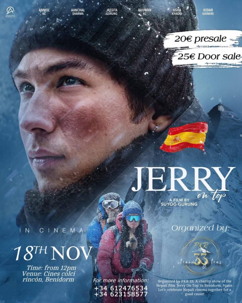 स्पेन — स्पेनको बेनिड्रोममा मंगलबार (१८ नोभेम्बर) जेरी अन टप नेपाली चलचित्र प्रदर्शन हुदैछ । पीकेआर ३३ ले प्रदर्शन गर्न लागेको सो चलचित्रको हालसम्म करिब १ सय टिकट बिक्री भैसकेको छ । बेनिड्रोमको सिने कोल्सी रिनकोनमा दिउँसो १२ बजे फिल्म प्रदर्शन हुदैछ ।