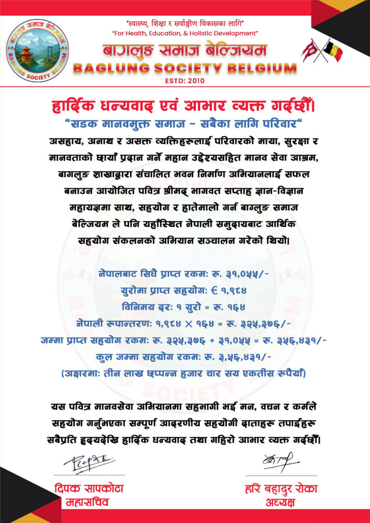 समाजले संकलित सम्पूर्ण रकम मानव सेवा आश्रम, बाग्लुङको बैंक खातामा विधिवत् रूपमा जम्मा गरिएको पुष्टि गरेको छ ।