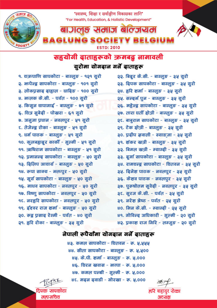 महासचिव दिपक सापकोटा तथा अध्यक्ष रोकाले सहयोग अभियानमा मन, वचन र कर्मले साथ दिने सम्पूर्ण बेल्जियमवासी नेपाली समुदायप्रति हार्दिक आभार तथा कृतज्ञता व्यक्त गरेका छन् । साथै भविष्यमा पनि समाजसेवा, मानवता र समुदायिक सहकार्यका अभियानहरूमा निरन्तर हातेमालो रहने विश्वास व्यक्त गरिएको छ ।