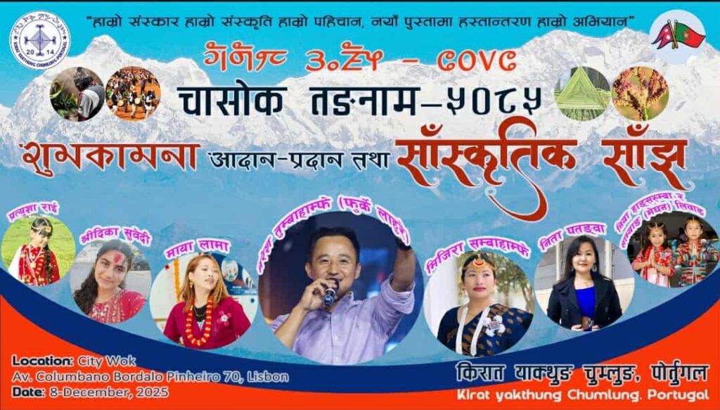 पोर्चुगल — किरात याक्थुङ चुम्लुङ पोर्चुगलले शुभकामना आदान प्रदान तथा साँस्कृतिक कार्यक्रम गर्ने भएको छ । लिम्बुहरुको महान चाड चासोक तङ्नाम ५०८५ को पावन अवसर पारेर आगामी डिसेम्बर ८ सोमबारका दिन लिस्बोन स्थित सिटि वोकमुन्दोमा कार्यक्रम आयोजना गर्ने भएको हो ।