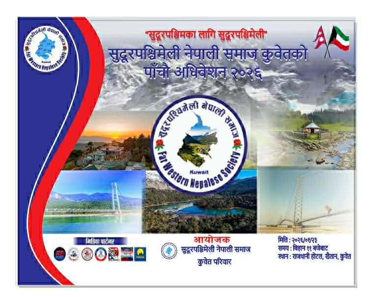 कुवेत — ‘सुदूरपश्चिमका लागि सुदूरपश्चिमेली’ भन्ने मूल मन्त्रलाई आत्मसात गर्दै सुदूरपश्चिमेली नेपाली समाज, कुवेतले आफ्नो पाँचौँ अधिवेशन भव्य रूपमा आयोजना गर्ने भएको छ । वैदेशिक रोजगारीको सिलसिलामा कुवेतलाई कर्मथलो बनाएका सुदूरपश्चिमेलीहरूको साझा संस्थाको रूपमा स्थापित यस समाजको अधिवेशन आगामी सन् २०२६ जनवरी २३ तारिख, शुक्रबारका दिन हुने तय भएको हो ।
